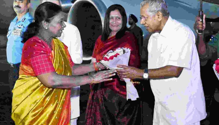തിരുവനന്തപുരം : രാഷ്ട്രപതി ദ്രൗപദി മുർമു വിവിധ പരിപാടികളിൽ പങ്കെടുക്കുന്നതിന് കേരളത്തിലെത്തി. തിരുവനന്തപുരം എയർഫോഴ്സ് ടെക്നിക്കൽ ഏര്യയിലെത്തിയ രാഷ്ട്രപതിയെ ഗവർണർ രാജേന്ദ്ര വിശ്വനാഥ് അർലേക്കർ, മുഖ്യമന്ത്രി പിണറായി വിജയൻ, കേന്ദ്ര സഹമന്ത്രി ജോർജ് കുര്യൻ, മേയർ ആര്യാരാജേന്ദ്രൻ, ആൻ്റണി രാജു എം.എൽ.എ, ചീഫ് സെക്രട്ടറി ഡോ. എ ജയതിലക്, മറ്റ് ഉന്നത ഉദ്യോഗസ്ഥർ എന്നിവർ ചേർന്ന് സ്വീകരിച്ചു. തുടർന്ന് രാഷ്ട്രപതി രാജ്ഭവനിലേക്ക് പോയി.
