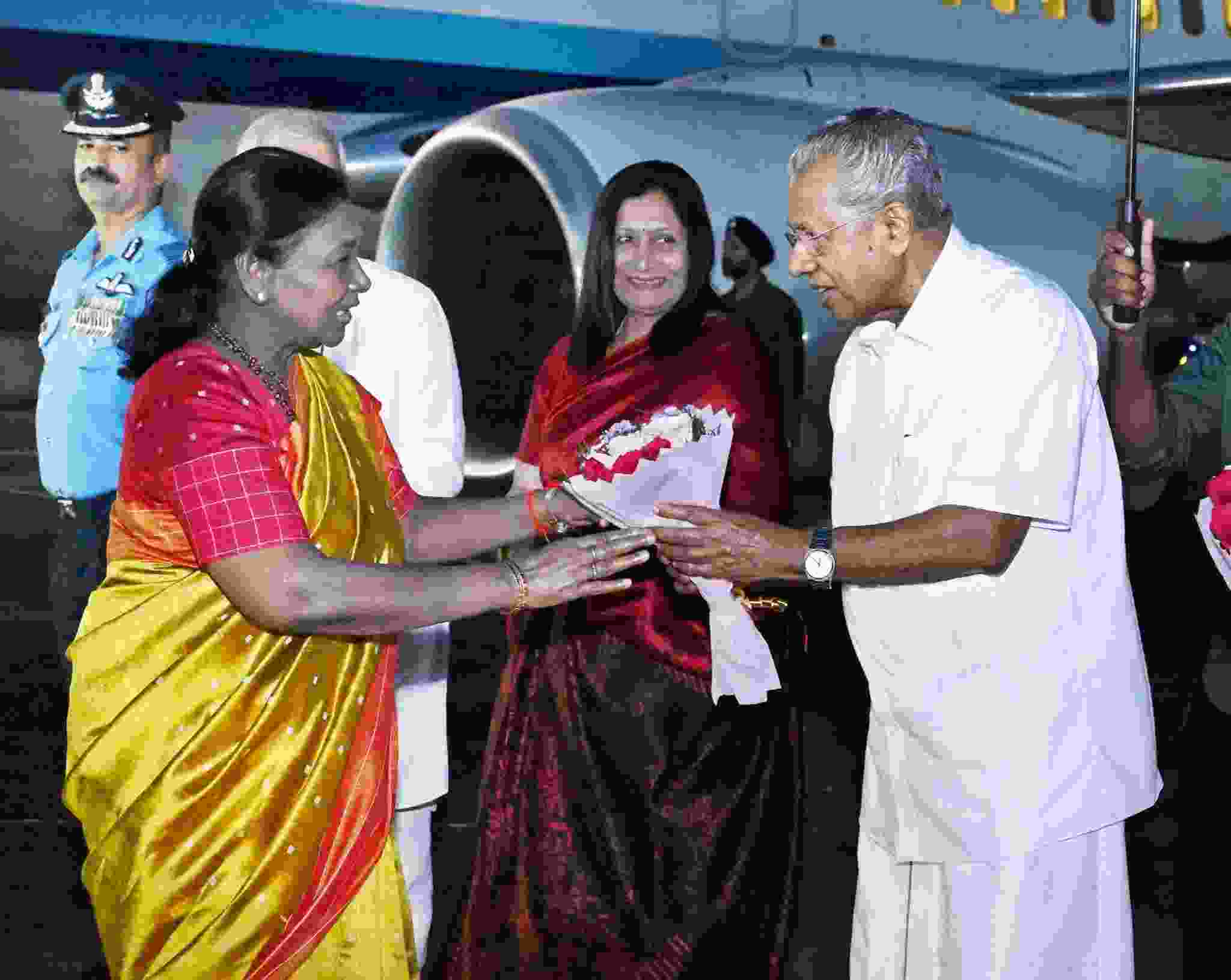 തിരുവനന്തപുരം : രാഷ്ട്രപതി ദ്രൗപദി മുർമു വിവിധ പരിപാടികളിൽ പങ്കെടുക്കുന്നതിന് കേരളത്തിലെത്തി. തിരുവനന്തപുരം എയർഫോഴ്സ് ടെക്നിക്കൽ ഏര്യയിലെത്തിയ രാഷ്ട്രപതിയെ ഗവർണർ രാജേന്ദ്ര വിശ്വനാഥ് അർലേക്കർ, മുഖ്യമന്ത്രി പിണറായി വിജയൻ, കേന്ദ്ര സഹമന്ത്രി ജോർജ് കുര്യൻ, മേയർ ആര്യാരാജേന്ദ്രൻ, ആൻ്റണി രാജു എം.എൽ.എ, ചീഫ് സെക്രട്ടറി ഡോ. എ ജയതിലക്, മറ്റ് ഉന്നത ഉദ്യോഗസ്ഥർ എന്നിവർ ചേർന്ന് സ്വീകരിച്ചു. തുടർന്ന് രാഷ്ട്രപതി രാജ്ഭവനിലേക്ക് പോയി.