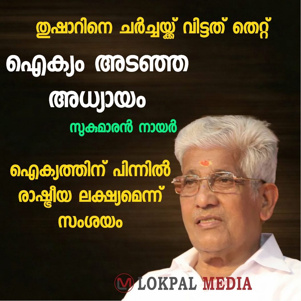 ”ഐക്യത്തെക്കുറിച്ച് സംസാരിക്കുമ്പോൾ എന്തിനാണ് ഒരു രാഷ്ട്രീയ മുന്നണിയുടെ നേതാവിനെ ഞങ്ങളുടെ അടുത്തേക്ക് പറഞ്ഞയക്കുന്നത്? തുഷാർ വെള്ളാപ്പള്ളി വരേണ്ടതില്ലെന്ന് നേരത്തെ തന്നെ അറിയിച്ചിരുന്നു. അച്ഛൻ മകനെ പറഞ്ഞയക്കുന്ന രീതി അംഗീകരിക്കാനാവില്ല. അവരുടെ സമീപനത്തിൽ വ്യക്തമായ രാഷ്ട്രീയമുണ്ടെന്ന് ഞങ്ങൾ തിരിച്ചറിഞ്ഞു,” സുകുമാരൻ നായർ പറഞ്ഞു.