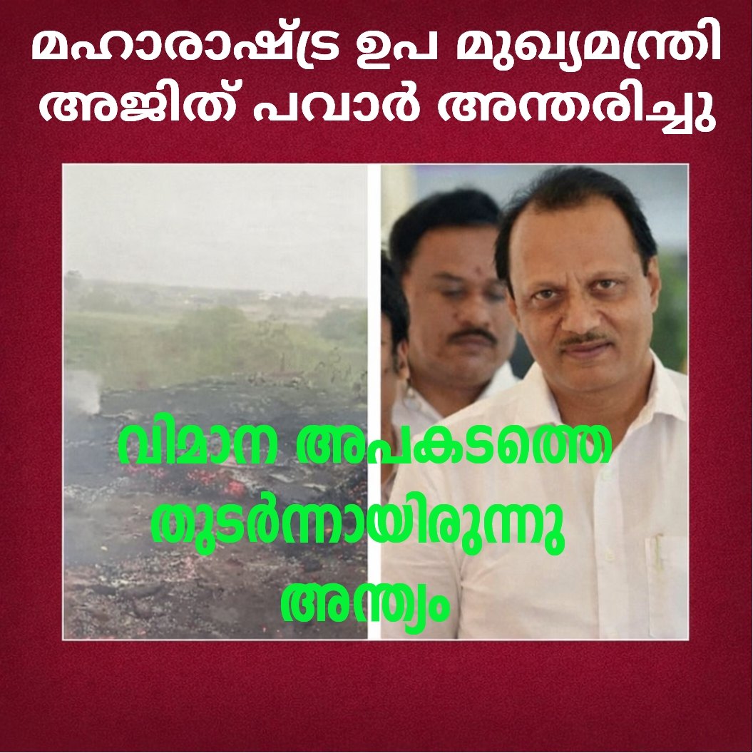 മഹാരാഷ്ട്ര രാഷ്ട്രീയത്തിലെ അതികായനായ അജിത് പവാറിന്റെ വിയോഗം സംസ്ഥാനത്തെ ഞെട്ടിച്ചിരിക്കുകയാണ്. മുഖ്യമന്ത്രി ദേവേന്ദ്ര ഫഡ്നാവിസ് സംഭവസ്ഥലത്തേക്ക് തിരിച്ചു. അപകടത്തെക്കുറിച്ച് സിവിൽ ഏവിയേഷൻ ഡയറക്ടറേറ്റ് (DGCA) ഉന്നതതല അന്വേഷണത്തിന് ഉത്തരവിട്ടു. സംസ്കാരം പിന്നീട് ബാരാമതിയിൽ നടക്കും.
